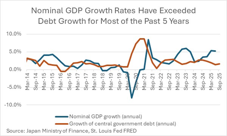 Nominal GDP growth has averaged 3.7% annually from 2021 through the present. Central government debt has been growing about 2.5% annually over the same period.