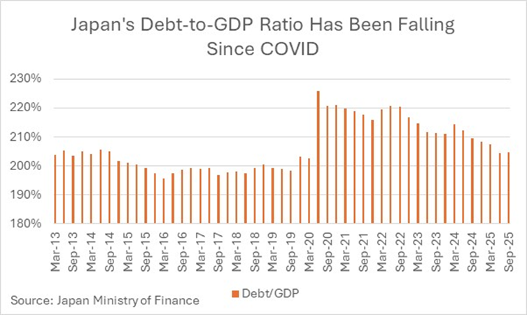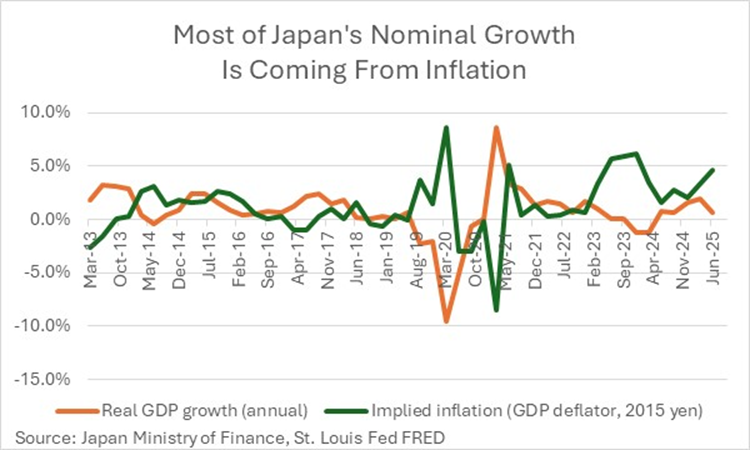 We have meager real GDP growth (~1.5% annual since 2021 and trending downward), above-target inflation (2.2-2.3% depending on the measure and trending upward), and the total stock of central government debt is increasing by about 2.5% per year. The debt/GDP ratio is falling, the yen is depreciating, and the stock market is on fire. The strategy of inflating away the debt burden—the correct policy choice in the eyes of many economists—is clearly working.