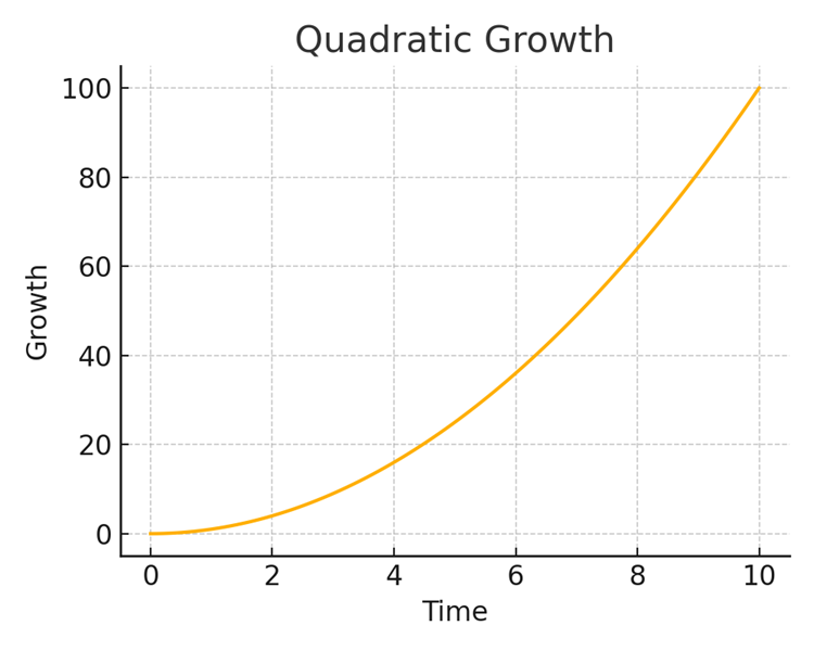 In the context of learning, quadratic growth applies when the mind starts to form connections between concepts. Understanding a new concept in any field doesn’t mean that the concept stands alone—your mind has the potential to draw a connection with every other concept you already know. The number of possible connections between concepts grows quadratically as you learn new concepts.