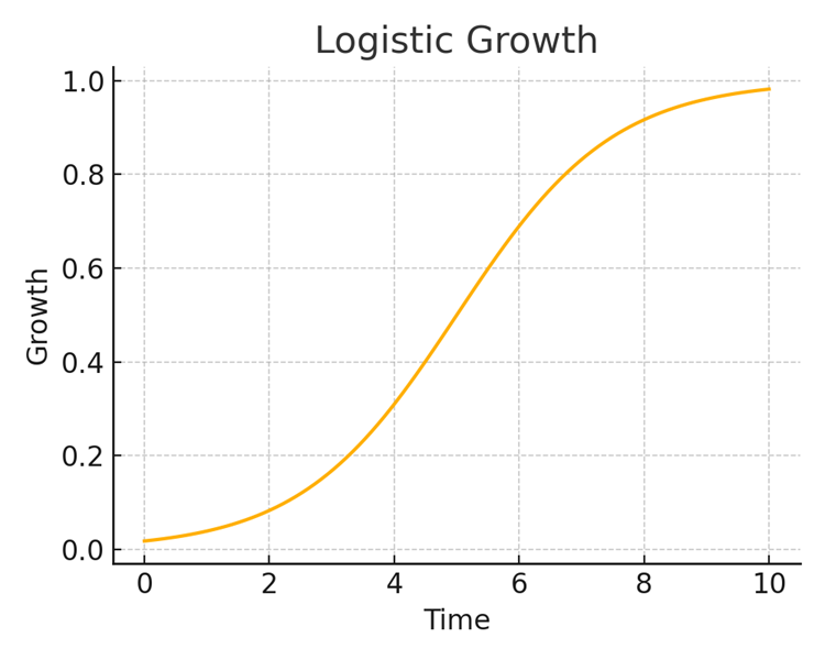 Also known as an s-curve, logistic growth is probably what most people think about with regards to learning. This is the “steep learning curve,” where skill gains accumulate rapidly early on and then start to slow. One example is fitness improvements—slow progress at the very beginning as we learn the basics, then rapid improvement, and then diminishing returns.