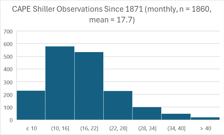 First, a histogram of monthly Shiller CAPE observations since 1871 (all data from Robert Shiller’s website):