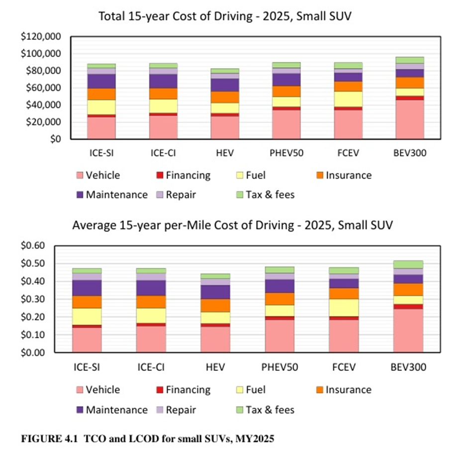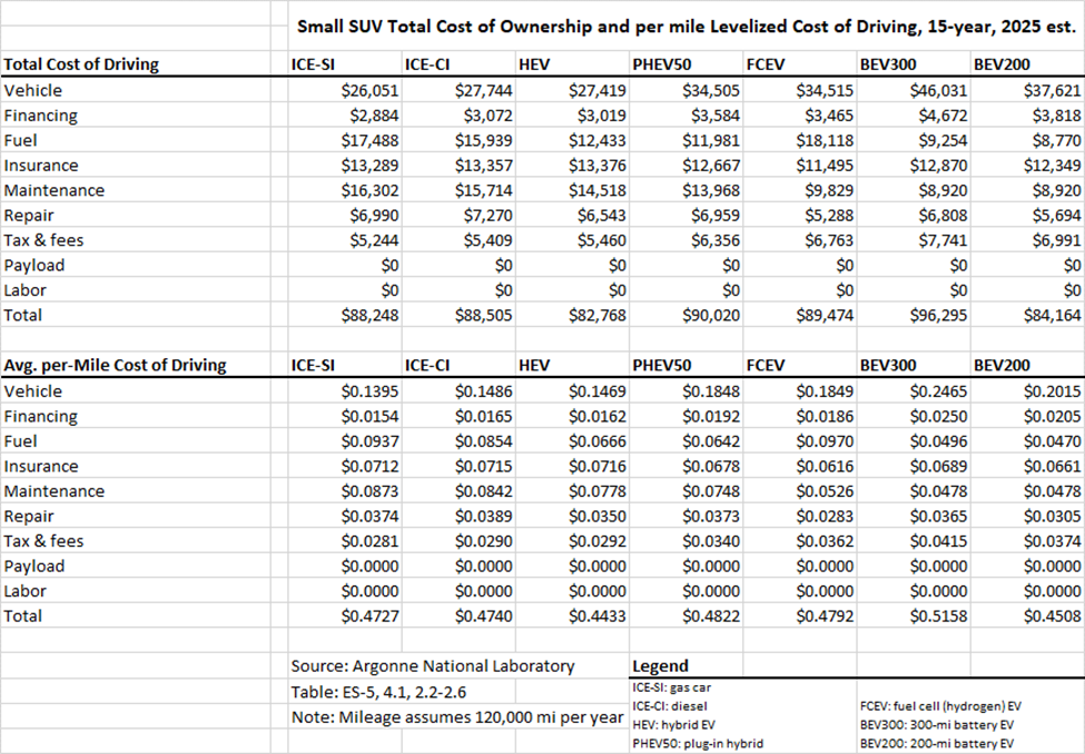To my delight, I found a 227-page report from the Argonne National Laboratory (ANL) covering exactly this topic. (Our government really does fantastic work in some respects.) The ANL report evaluates the cost tradeoff between powertrains (various ICEs vs. EVs) using two main metrics, Total Cost of Ownership (TCO) and per-mile Levelized Cost of Driving (LCOD). The TCO is just the total dollar amount it will cost you to operate the vehicle for 15 years (driving 12,000 miles per year) considering all expenses, including maintenance, fuel, taxes, insurance and so on. The LCOD is the same analysis, just calculated as a per-mile cost.