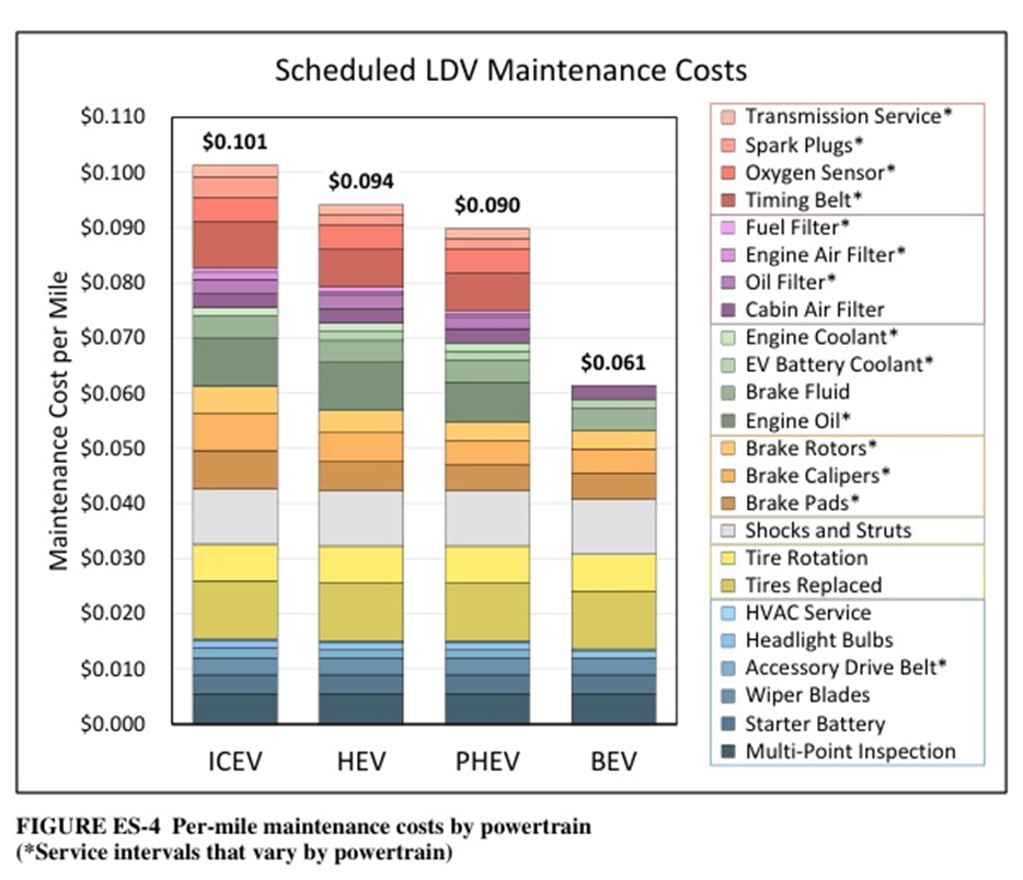 The bottom line is that EVs are much easier to maintain than ICE vehicles. Argonne has a useful chart demonstrating maintenance expenses by powertrain (LDV = light-duty vehicle):