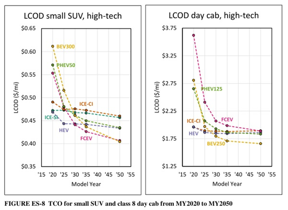 Legend: ICE-SI = Internal Combustion Engine-Spark Ignition (gasoline); ICE-CI = Internal Combustion Engine-Compression Ignition (diesel); HEV = Hybrid Electric Vehicle; PHEV50 = Plug-in Hybrid Electric Vehicle; FCEV = Fuel Cell Electric Vehicle (hydrogen); BEV300 = Battery Electric Vehicle-300mi Range