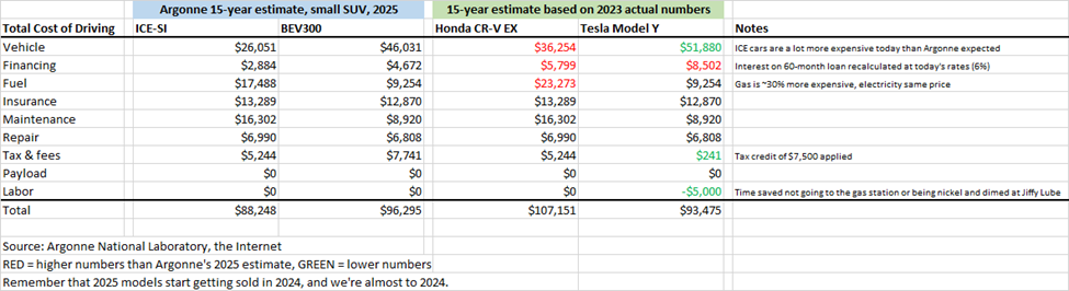 The powertrain’s efficiency also matters, not just the price of the fuel. A Model Y gets about 3.5 miles per kWh—at 13c/kWh, that comes out to 3.71c per mile. A Honda CRV gets about 30 mpg, so at $3.50/gallon, that comes out to 11.67c per mile. Argonne forecasted an ICE small SUV to pay about 2x the fuel cost of an EV, but my rough math suggests the fuel cost of an ICE SUV is closer to 3x of an EV.